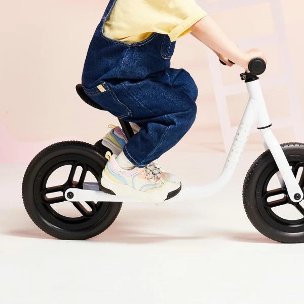 Le repose-pieds l’invite à décoller les pieds, et donc à jouer avec son équilibre. La position du repose-pieds le prépare à mettre ses pieds au bon endroit lorsqu’il passera au vélo.